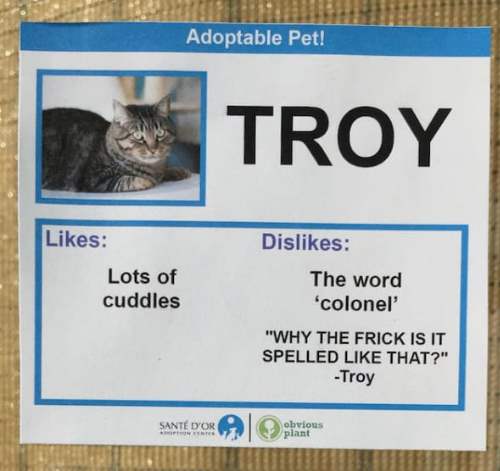 Facebook og Tumblr-brukeren «Obvious Planet» har et pågående prosjekt hvor de «sniker morsomme skilt inn i den virkelige verden.» For å samtidig hjelpe noen i nød, lagde han morsomme biografier til noen katter på Sante D’or Adotion Center.