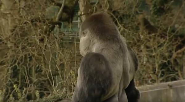 Den store gorillaen har fanget opp hvordan dyrepasserne beveger seg, og har begynt å herme etter dem. Og istedenfor å bevege seg på alle fire, så går nå altså Ambam på to bein, oppreist og rakrygget som et menneske.