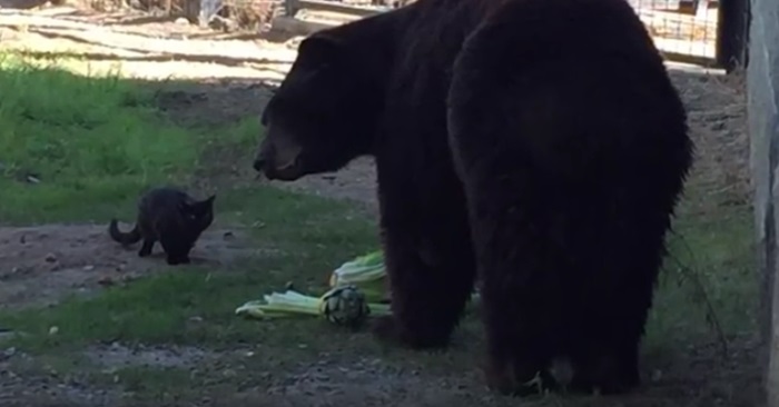 Katten besøker bjørnen hver dag. Men følg med på bjørnens REAKSJON når han ser henne!